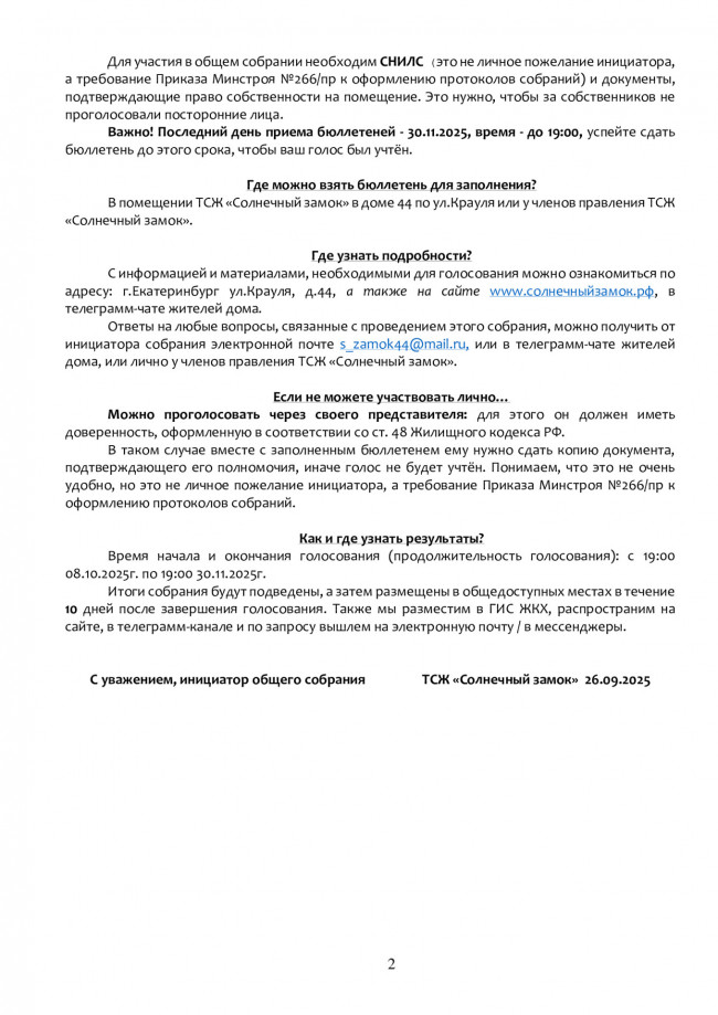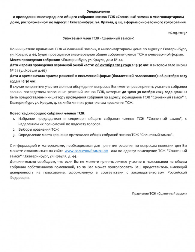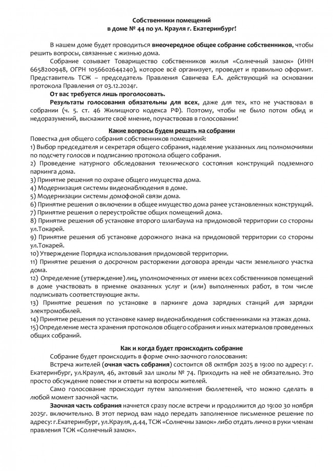 В нашем доме с 08 октября по 30 ноября 2025г. будут проводиться внеочередные собрания собственников и членов ТСЖ "Солнечный замок"